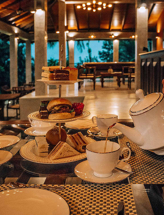 The Verandah, located in the Central Bungalow, offers stunning views of the main pool and surrounding mountains. Ideal for any occasion, from intimate dining in Kandy to sunset canapes and drinks, the menu blends international flavors with Sri Lankan influences, creating a memorable culinary experience.