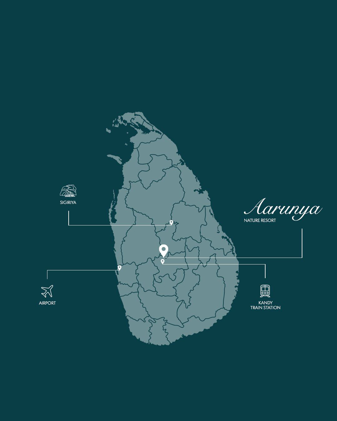 Aarunya is centrally located in Sri Lanka nestled between Kandy and Dambulla, making it an ideal base for exploring the island’s cultural and natural wonders. The resort is just a 2-3 hour drive from Bandaranaike International Airport, 30-45 minutes from Kandy train station, and within 1-2 hours of iconic sites like Sigiriya Rock Fortress and the UNESCO-listed Knuckles Mountain Range. Whether you seek authentic on-property experiences or excursions to nearby attractions on and off the beaten track, Aarunya offers premium comfort and personalized concierge services to enhance your journey. Discover the best of Sri Lanka’s natural beauty and cultural heritage from our strategically located nature retreat, perfect for those looking for the best hotel in Kandy, Sri lanka, to revitalize mind, body, and soul.